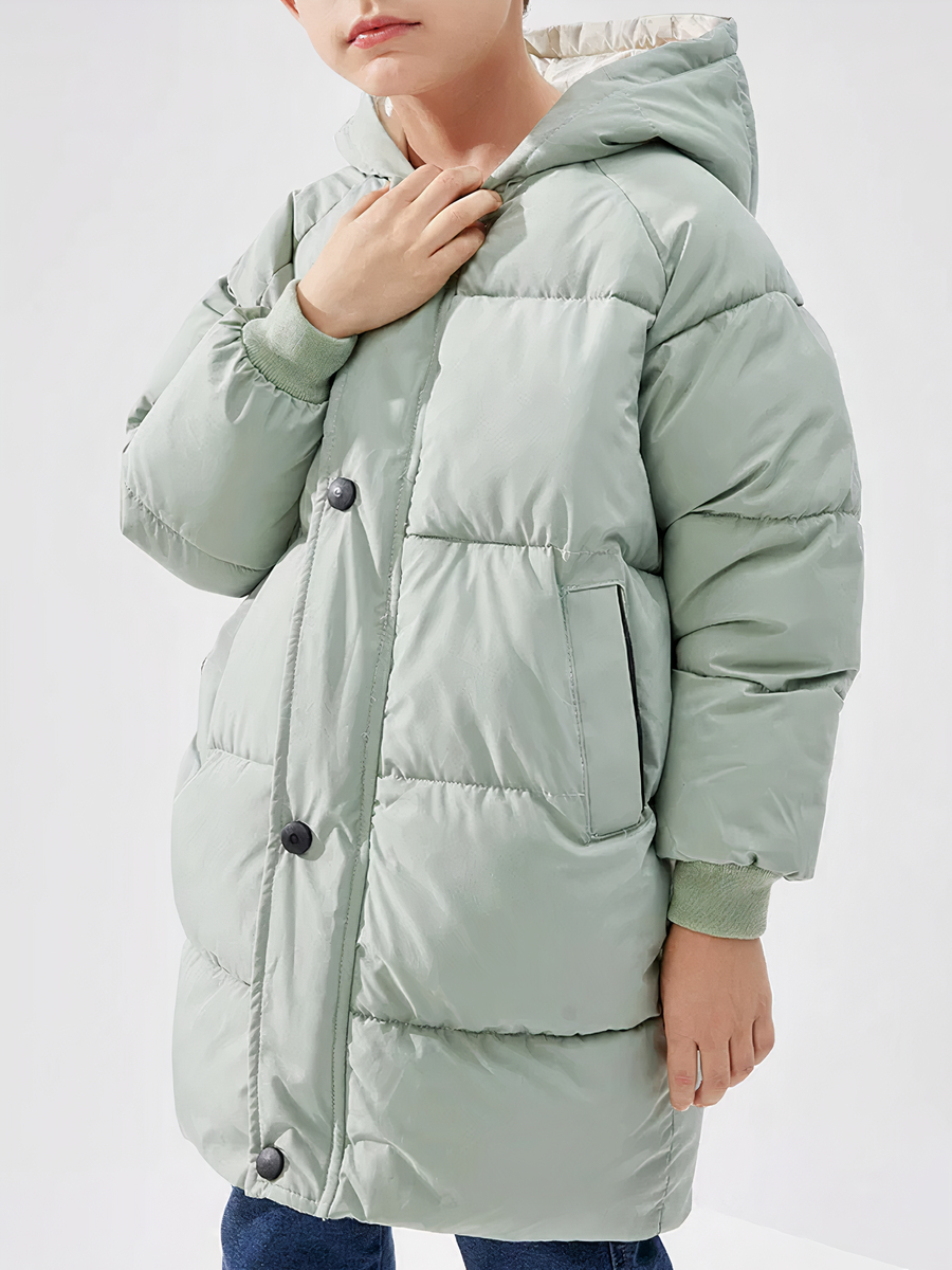 Emmitouflez votre enfant dans cette veste doudoune longue et verte, parfaite pour braver les frimas avec élégance. Sa construction en coton lui procure une isolation optimale, tandis que la capuche et les poches augmentent sa fonctionnalité. Les boutons ajoutent une touche classique à ce vêtement indispensable pour les mois d'hiver.