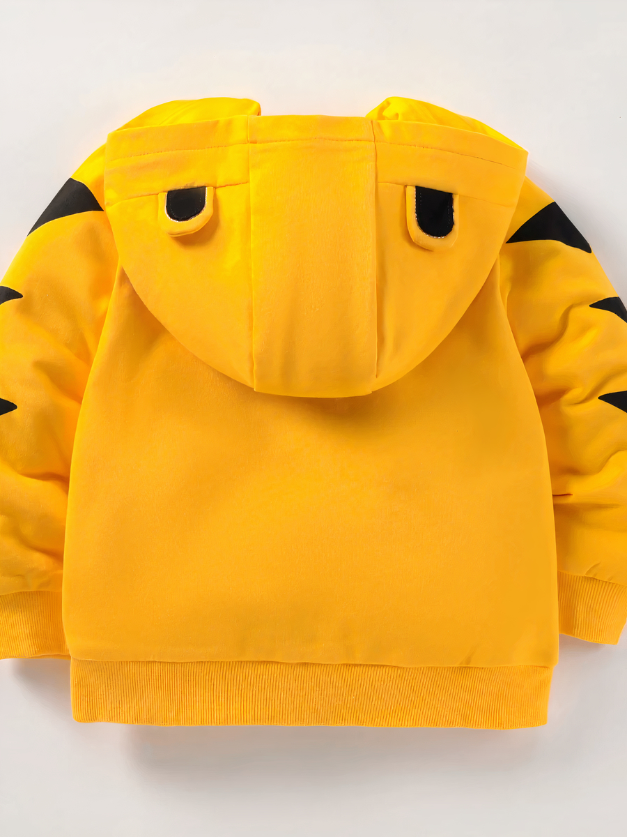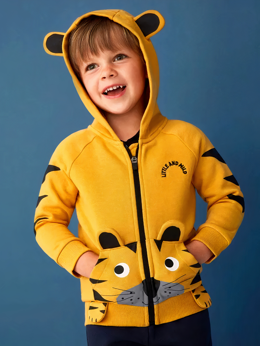 Cette veste pour garçon séduit par son design créatif de tigre, en jaune vibrant, avec des oreilles sur la capuche pour éveiller l’imagination. Fabriquée en un mélange doux de coton et polyester, elle dispose de poches pratiques et d’une fermeture zippée, alliant confort, fonctionnalité et fun.