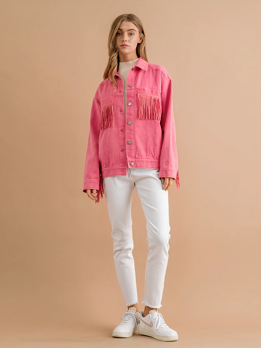 Revivez l'apogée du style vintage avec cette veste à franges en rose éclatant. La combinaison de coton et polyester promet confort et facilité d'entretien, tandis que les franges sur les poches offrent une allure ludique et chic. La coupe courte et les boutons viennent parfaire ce vêtement, le rendant indispensable pour un look rétro-modernisé.