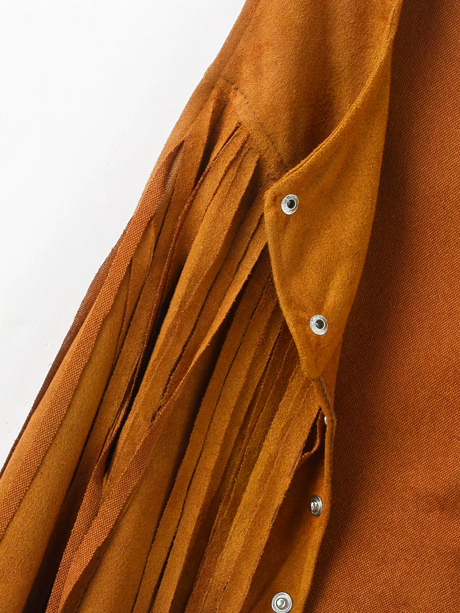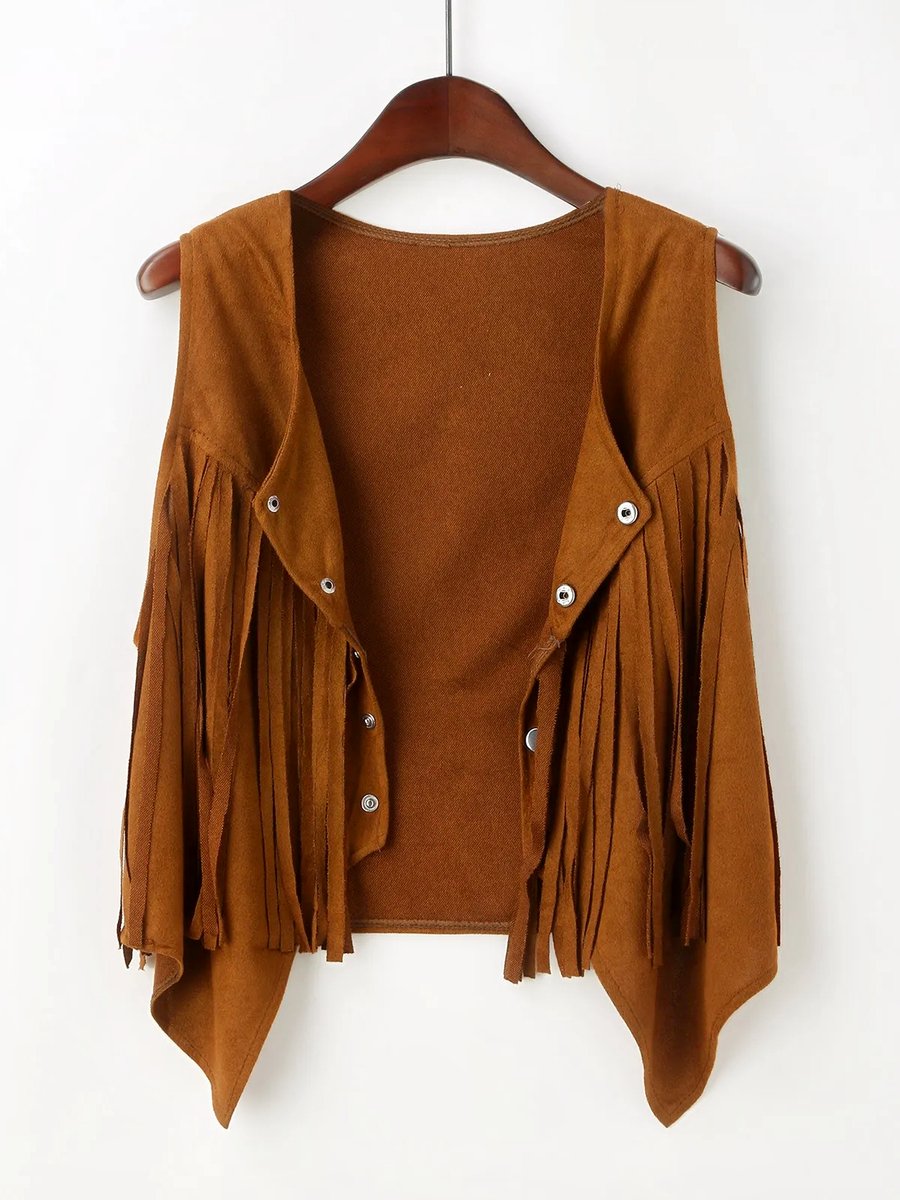 Inspirée du style rétro, cette veste à franges sans manches en couleur marron pour femme est un classique revisité. En polyester, sa coupe courte et ses boutons soignés évoquent une élégance vintage. Parfaite pour ajouter une touche bohème à vos tenues, elle allie originalité et confort.