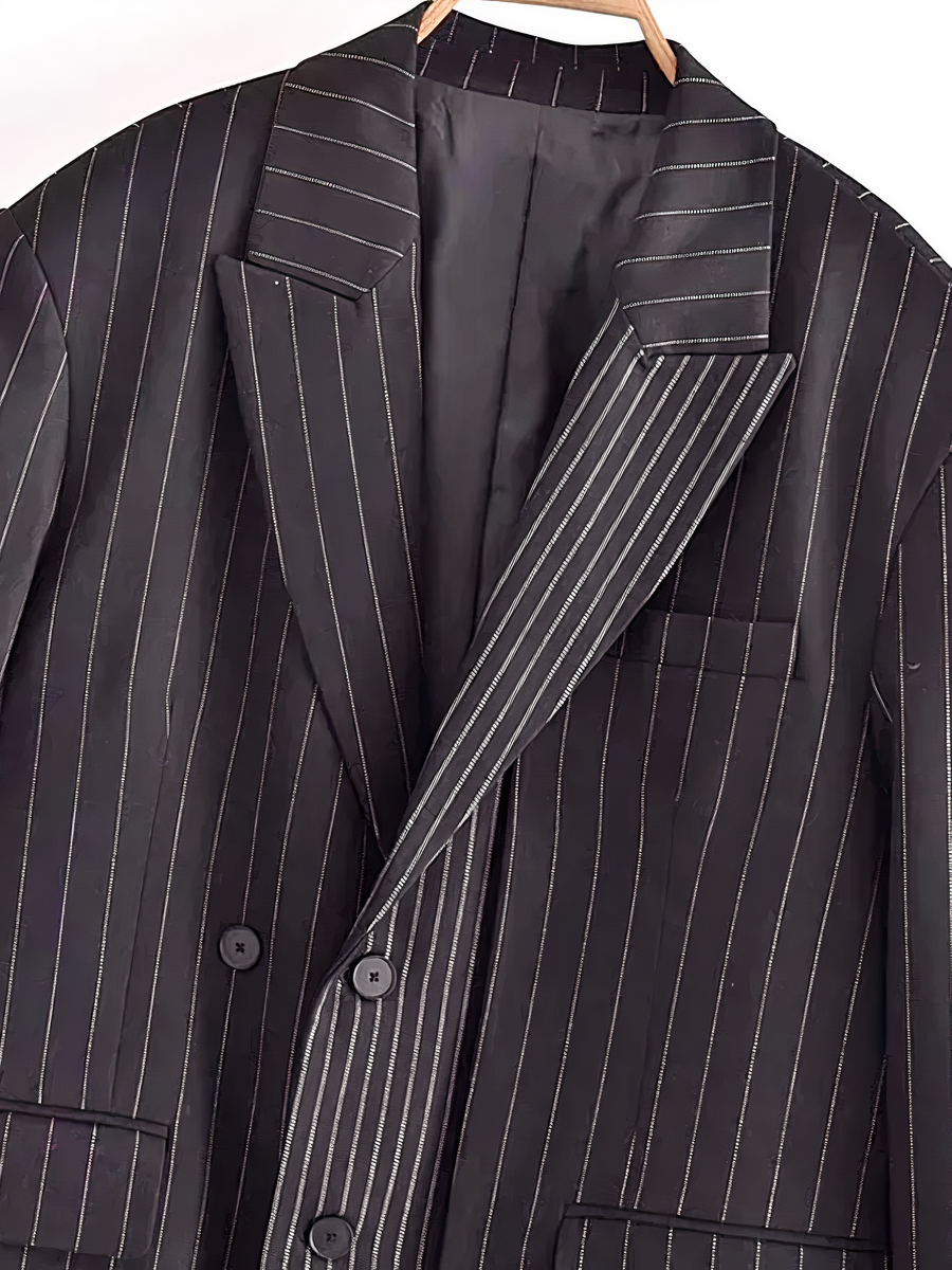 L'alliance du design oversize et des motifs à rayures confère à cette veste blazer femme une présence remarquable. Elle est idéale pour les femmes qui désirent éléver leur style avec assurance et originalité. Cette veste n'est pas juste un vêtement, mais une déclaration de style, prête à transformer n'importe quelle tenue en un ensemble impressionnant.