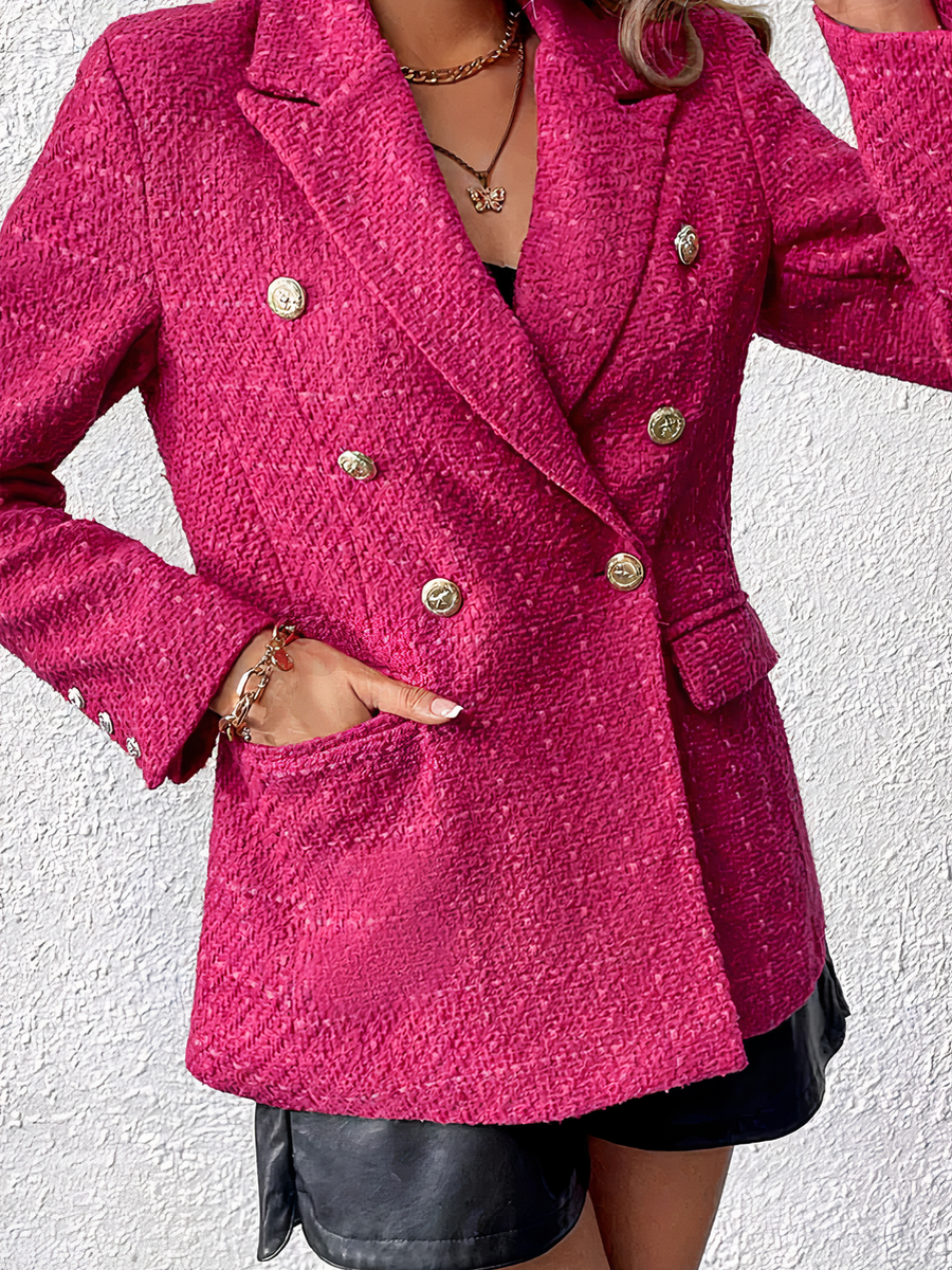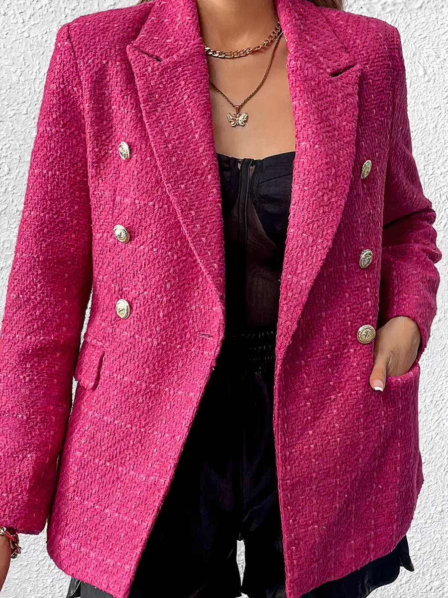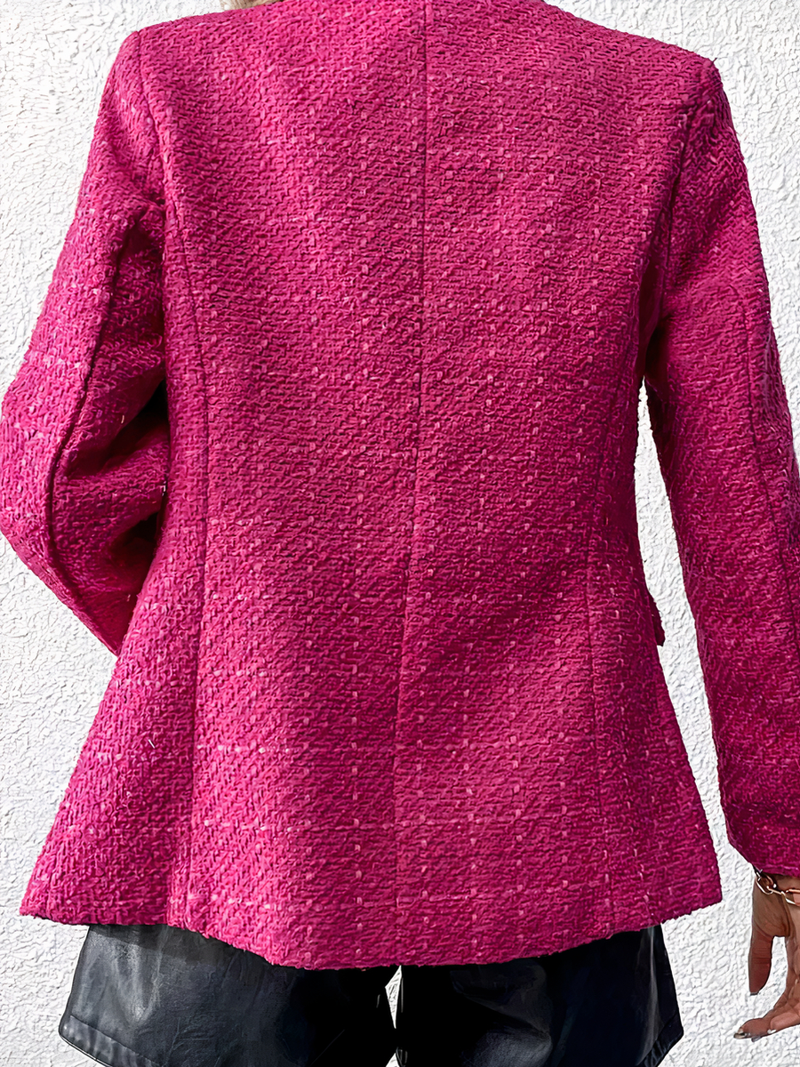 Chaque détail de cette veste blazer pour femme a été soigneusement pensé pour en faire une pièce maîtresse. Le col à revers cranté et la fermeture à double boutonnage central avec ses boutons argentés élégants soulignent un design classique revisité. L'effet tweed, associé à la douceur de la couleur rose, crée un contraste visuel captivant, faisant de cette veste un choix privilégié pour celles qui cherchent à allier tradition et tendance.