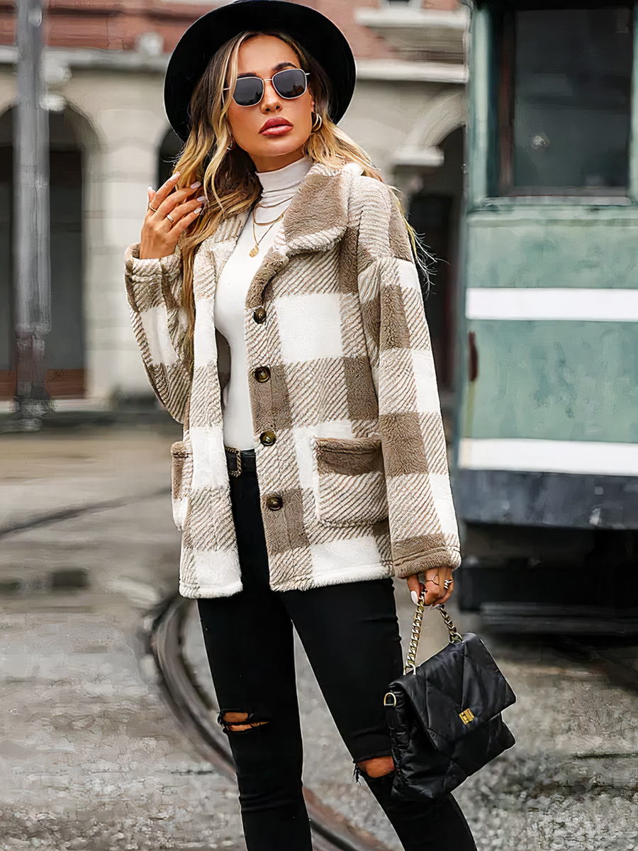 Veste chaude femme avec motifs à carreaux en fausse fourrure