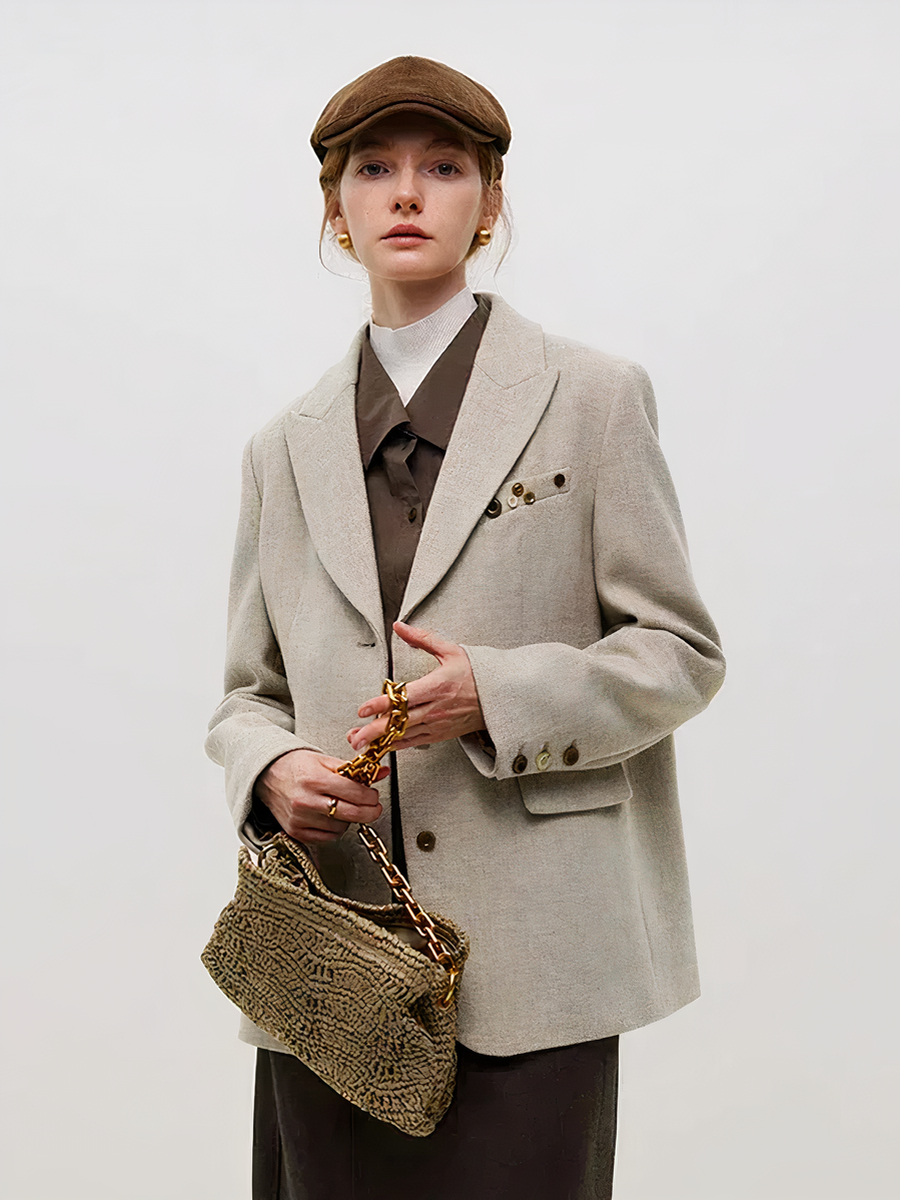 Rehaussez votre style avec cette veste costume en laine de couleur beige. Sa conception épaisse offre une chaleur inégalée pendant les mois froids, tout en maintenant une allure chic et décontractée. Idéale pour les femmes qui recherchent à combiner style et praticité, elle est parfaite pour une journée au bureau ou pour un week-end détente.