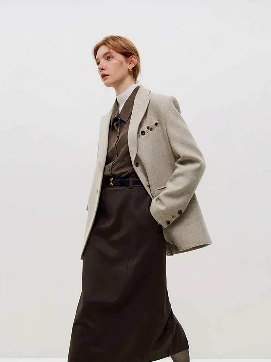 Optez pour le confort et le style avec cette veste costume femme décontractée et épaisse en laine beige. Conçue pour une allure décontractée, elle allie chaleur et élégance grâce à son épaisseur et sa coupe confortable, idéale pour les journées plus fraîches.