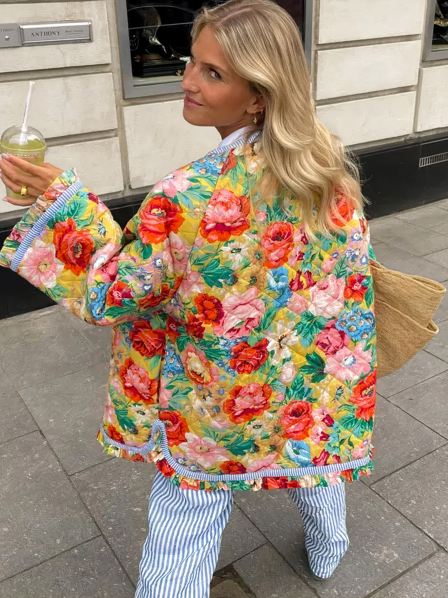 Égayez votre garde-robe avec cette veste fleurie en coton. Ses couleurs vives et son motif floral apportent une explosion de joie, tandis que sa coupe courte et ses boutons en font un choix tendance pour un look décontracté ou chic. C'est la pièce parfaite pour ajouter une touche de fantaisie à vos tenues quotidiennes.