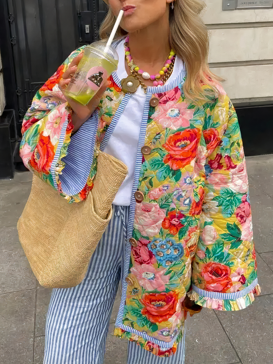 Cette veste fleurie multicolore pour femme est un véritable éclat de couleur et de joie. Confectionnée en coton doux, elle est agrémentée de boutons délicats, offrant une coupe courte et charmante. Parfaite pour ajouter une touche de fantaisie et de fraîcheur à votre garde-robe.