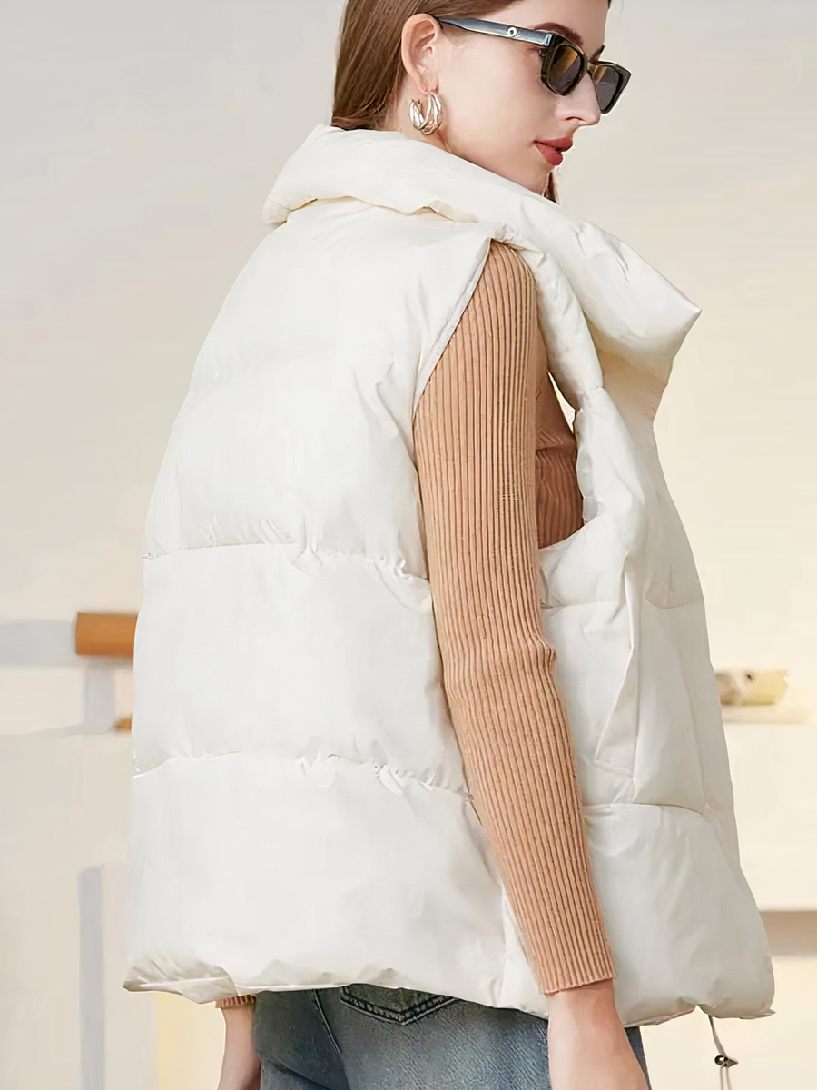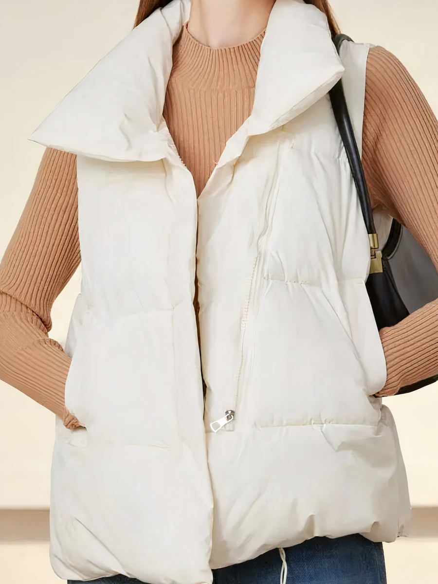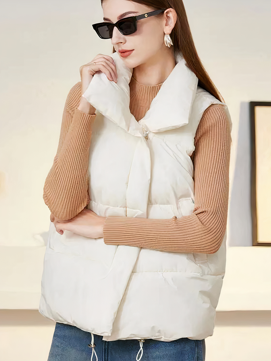 La veste sans manche pour femme, courte et chaude, est une pièce idéale pour l’hiver. De couleur blanche et fabriquée en polyester avec une doublure intérieure, elle combine élégance et fonctionnalité. Sa fermeture à zipper centrale et son grand col à revers épais offrent chaleur et style.