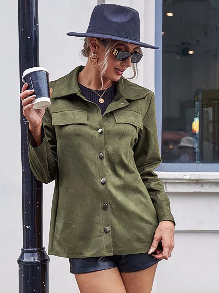 Cette veste en suédine verte pour femme, de style décontracté, est l’incarnation parfaite de l’élégance classique. Elle présente des poches pratiques et des boutons raffinés, avec un col rabattu ajoutant une touche de sophistication. En polyester, elle offre confort et durabilité, idéale pour un look quotidien stylé.