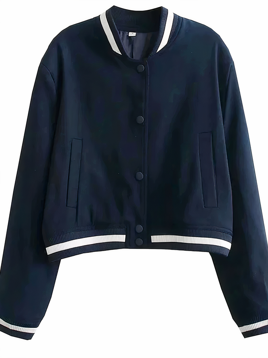 Adoptez un look sport-chic avec notre veste teddy pour femme. Alliant confort et style, cette veste couleur bleu marine est rehaussée par des ourlets côtelés ornés d’une bande blanche, apportant une touche d’élégance décontractée. Le col rond style bombers et la fermeture à boutonnage simple centrale son design intemporel.