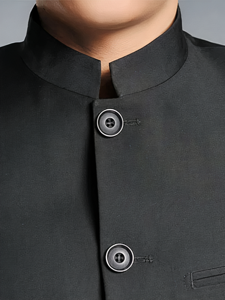 Notre veste habillée pour homme avec col mao est un exemple parfait de raffinement. Disponible en noir, cette veste mi-longue est fabriquée en polyester et viscose, offrant une élégance intemporelle. Avec son boutonnage simple et son col mao distinctif, elle incarne un style à la fois formel et sophistiqué.