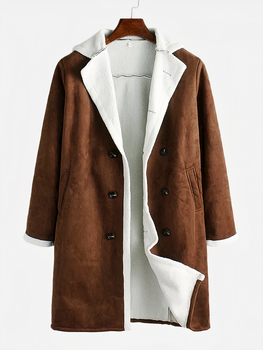 Dotée d'un grand col à rabat en polaire blanc, cette veste mouton marron pour homme chaude se distingue par son design élégant. Elle dispose de deux grandes poches à l'avant, pratiques pour ranger vos objets personnels. Le boutonnage simple central ajoute une touche de sophistication, rendant la veste adaptée à une variété d'occasions, des sorties décontractées aux événements plus formels.