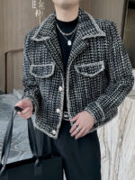Cette veste style Chanel pour homme, à la croisée entre élégance et streetwear, se présente en noir et blanc. Son design tissé, avec des coutures blanches sur fond noir, offre un look distinctif. Courte et dotée d’un col à revers élégant, elle est idéale pour la mi-saison.