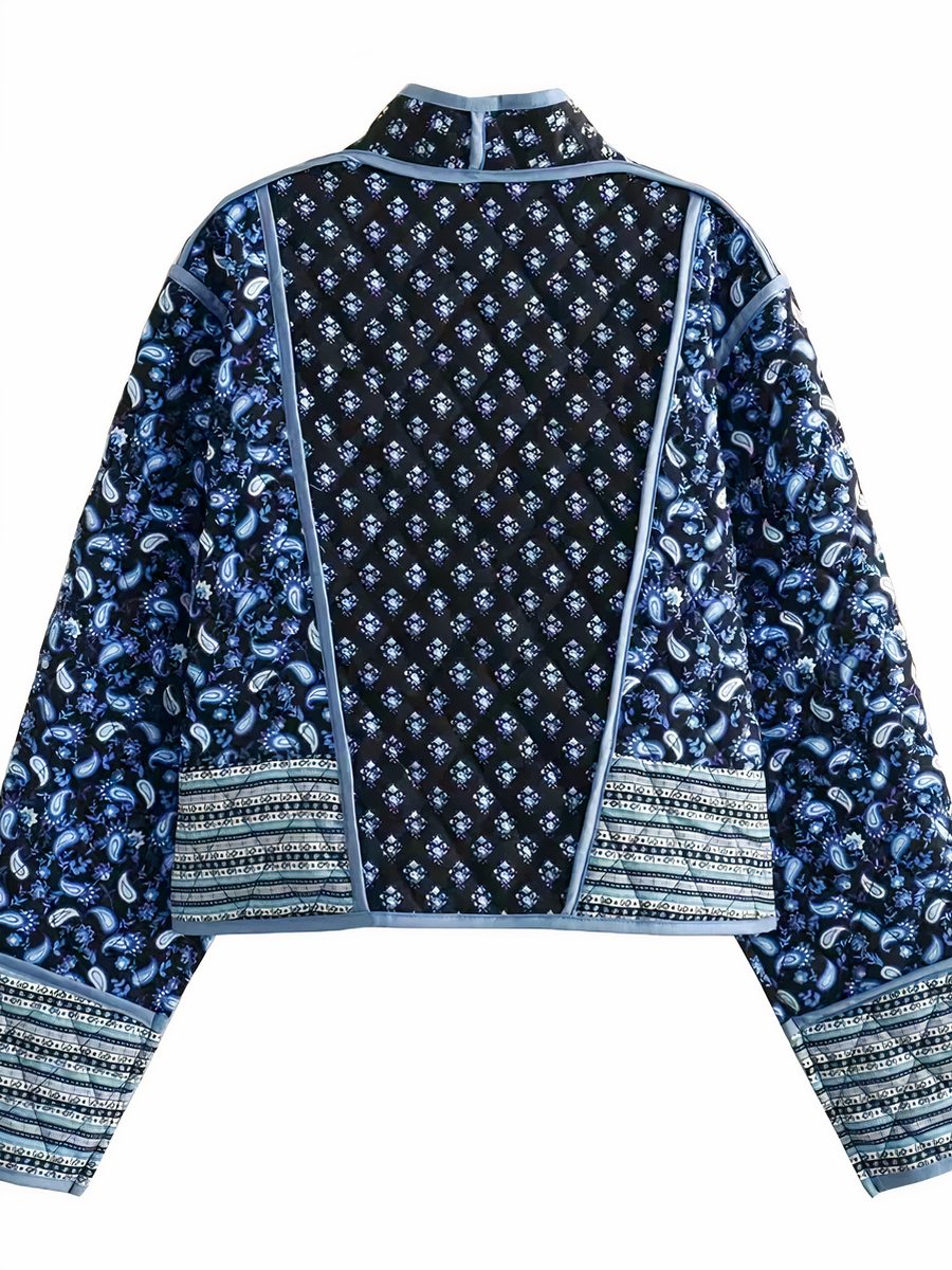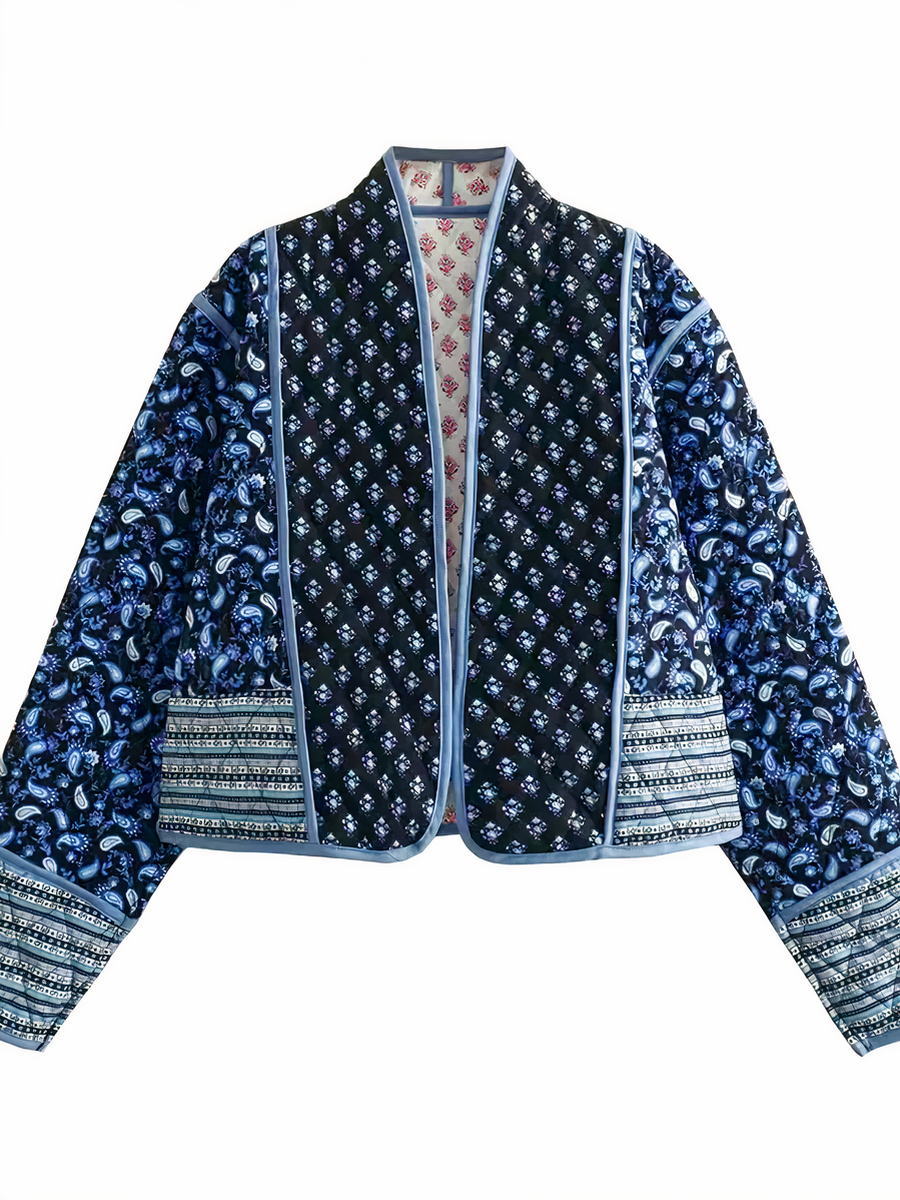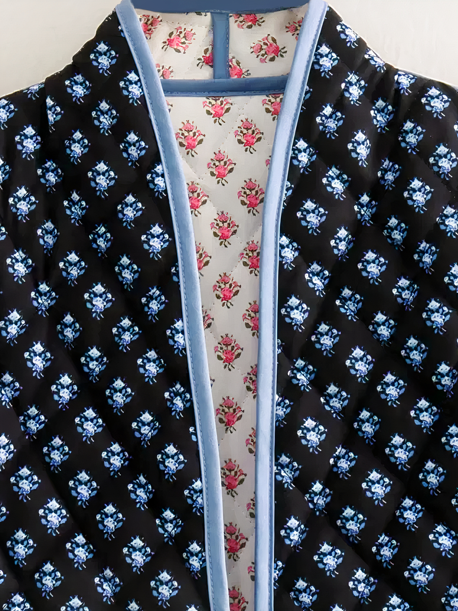 L'aspect réversible de la veste patchwork multiplie les possibilités de style, vous permettant de naviguer entre un look doux et romantique et une allure plus audacieuse et mystérieuse. Les imprimés floraux ajoutent une dimension romantique et féminine, tandis que le contraste du bleu et du noir offre une option plus sobre et sophistiquée. Cette dualité fait de la veste un indispensable de la garde-robe, capable de compléter une grande variété de tenues.