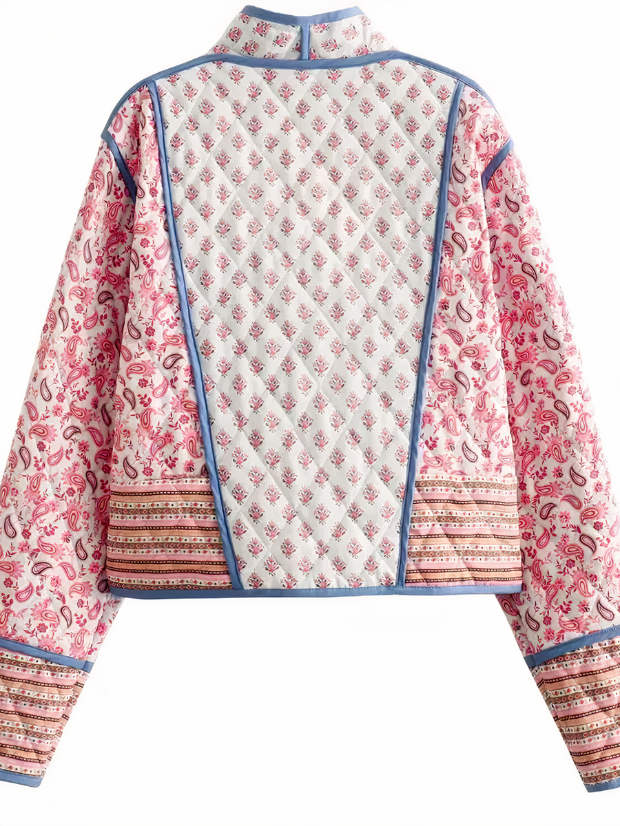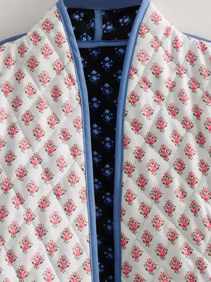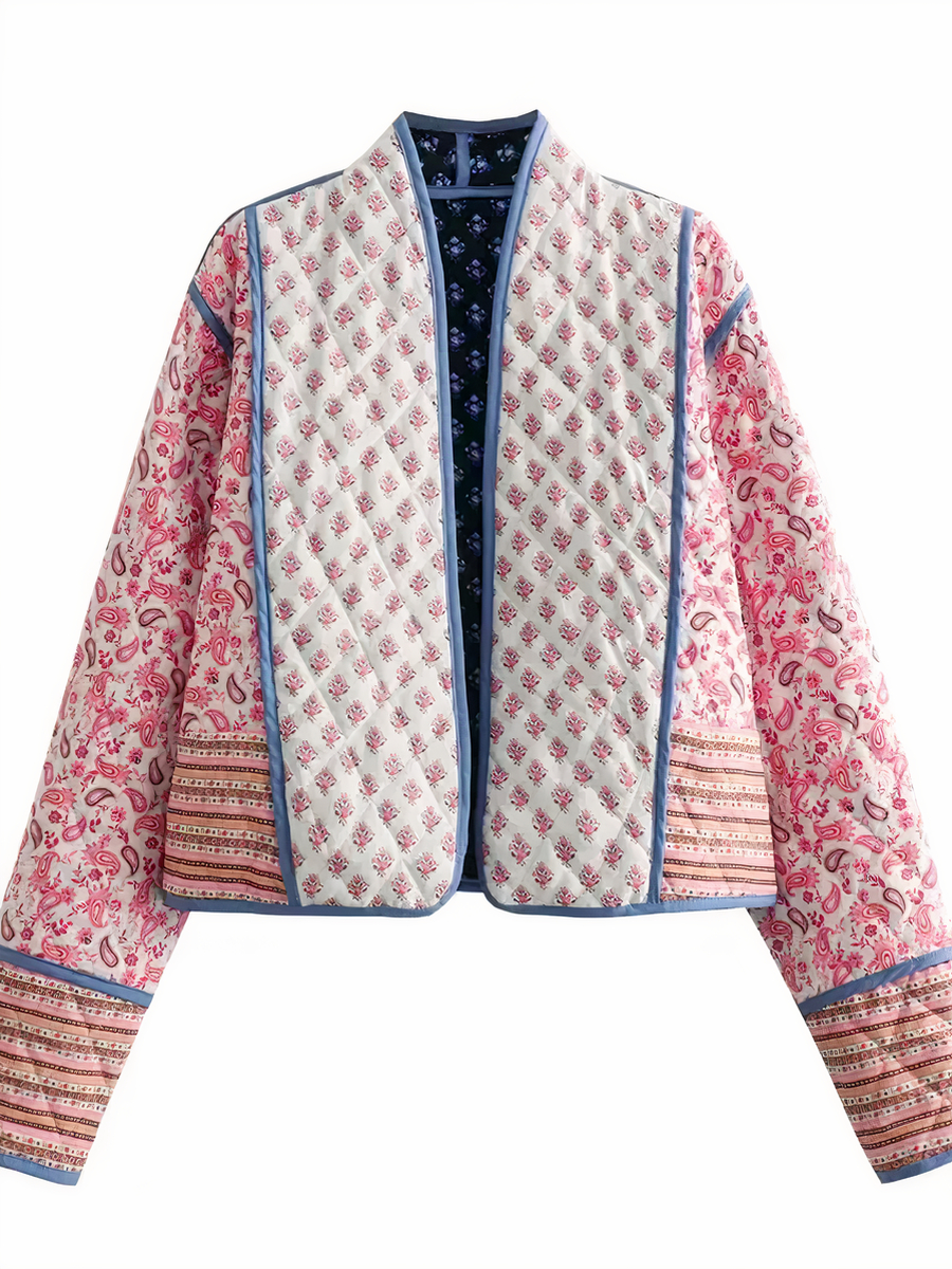 Notre veste patchwork réversible est une pièce maîtresse de polyvalence et d’élégance, offrant deux styles distincts en un. Selon l’humeur et l’occasion, choisissez entre un charmant rose avec des imprimés floraux, ou basculez vers un bleu profond. Cette veste sans fermeture est conçue pour être portée en toute saison.