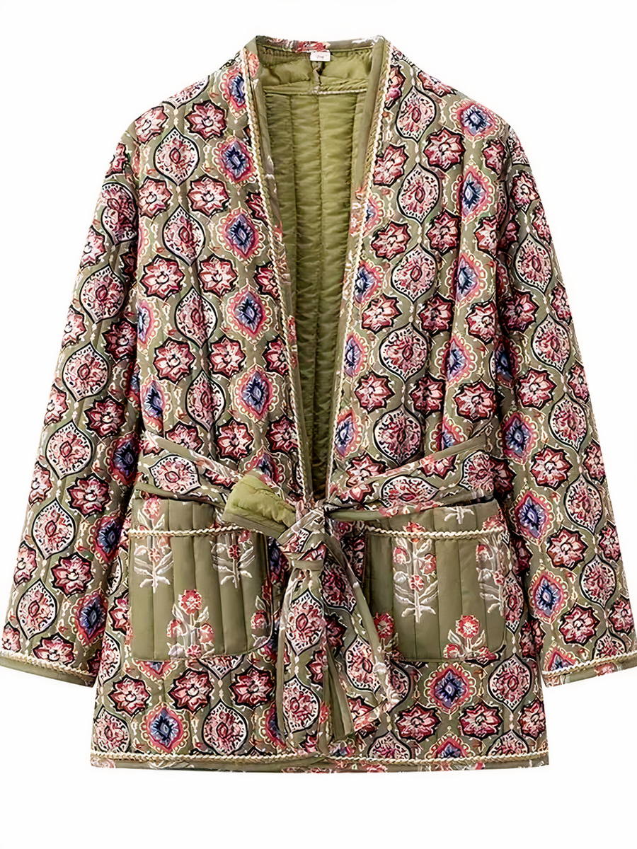 Fabriquée en polyester, avec un intérieur vert matelassé, cette veste patchwork promet non seulement une isolation thermique efficace mais aussi un confort inégalé. Son design comprend des manches longues et un ruban ceinture à la taille, permettant de fermer la veste tout en marquant élégamment votre silhouette. Le col V ajoute une touche de féminité, tandis que les deux poches latérales offrent un espace pratique pour garder vos mains au chaud ou sécuriser vos petits objets personnels.