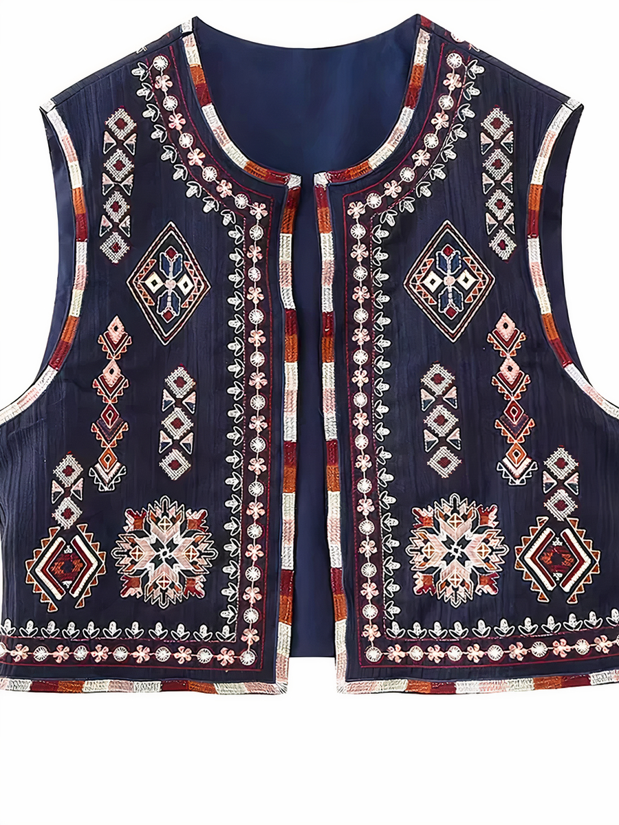 Découvrez notre veste patchwork sans manche, une pièce unique qui apportera une touche bohème et élégante à votre garde-robe. Confectionnée en polyester, cette veste de couleur bleu marine est embellie de broderies fleuries aux nuances rougeoyantes et de formes géométriques, offrant un contraste saisissant et une esthétique riche.