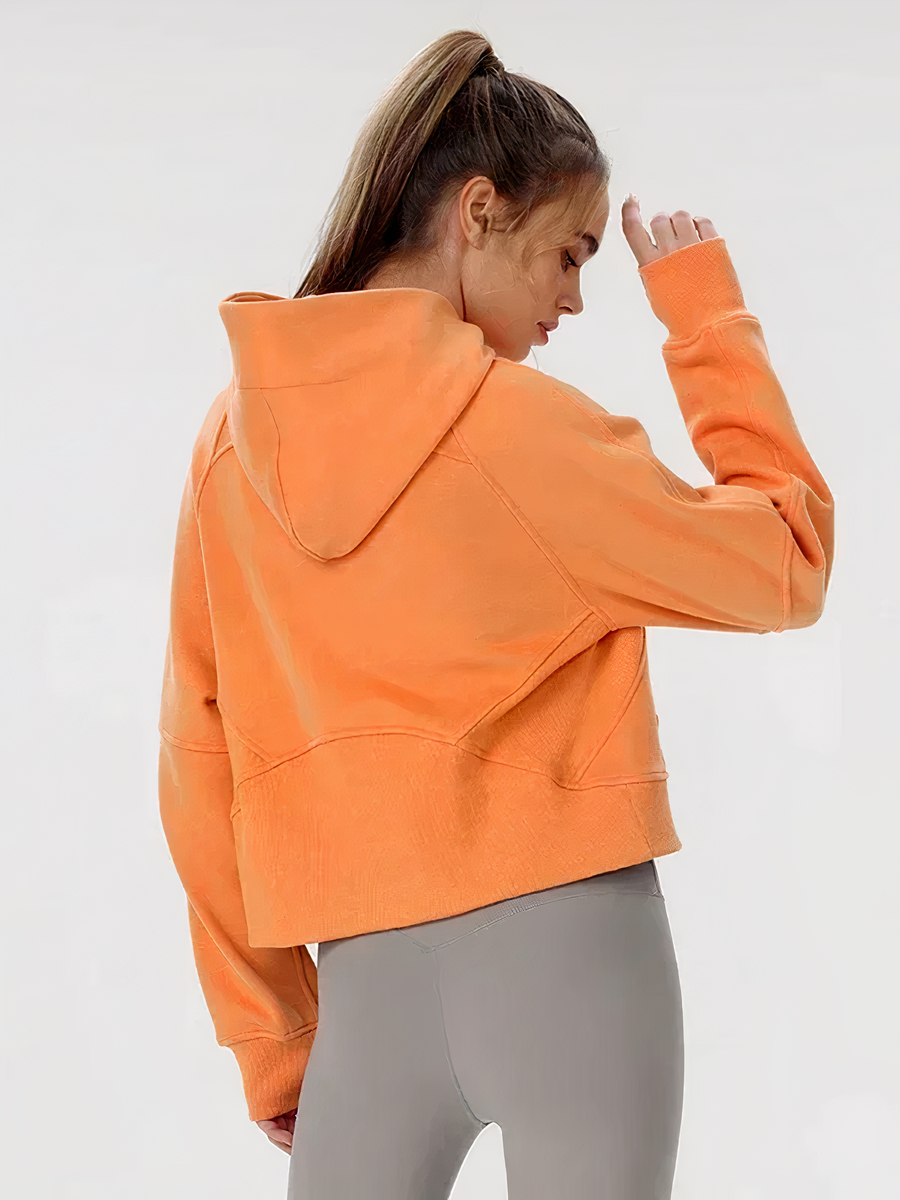 Veste running femme orange et courte à capuche